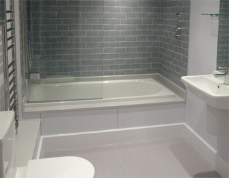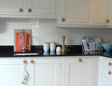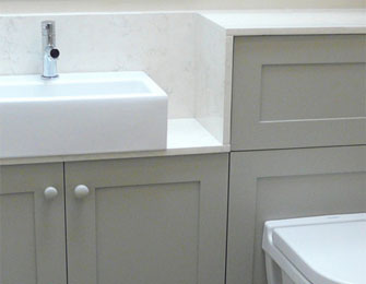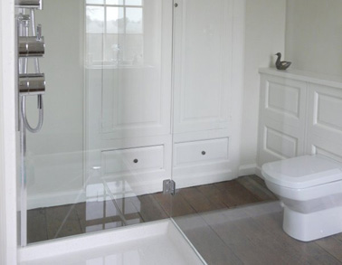 A minimal shower of Corian and glass. Gorgeous floor boards. The concealed cistern boxing has been made-up using the same moulding detail as the original cupboards.