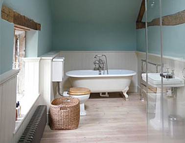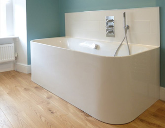 Elegant family bathroom, mixing colour, white ceramic, engineered oak and Arena Stone surfaces, a traditional setting and contemporary design which sits effortlessly within this late 17th century home.