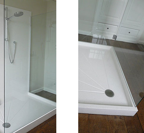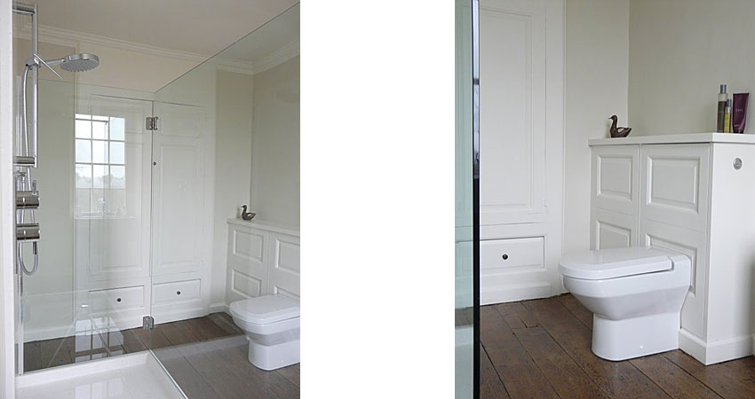 A minimal shower of Corian and glass. Gorgeous floor boards. The concealed cistern boxing has been made-up using the same moulding detail as the original cupboards.