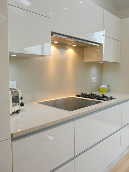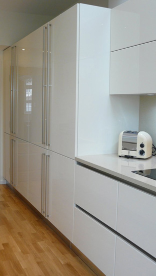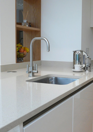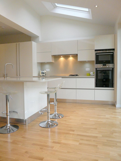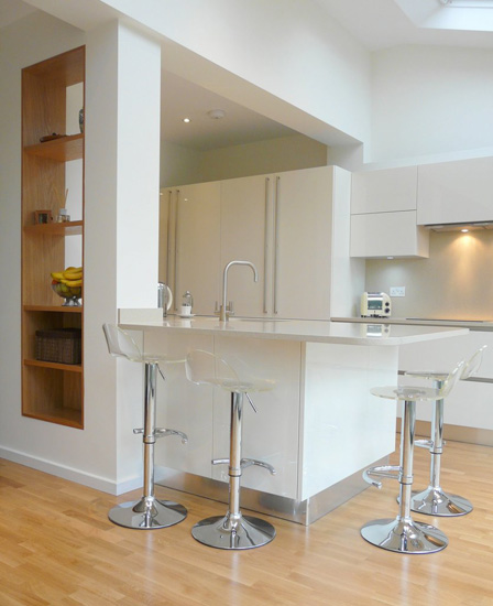 Bespoke oak shelves compliment this clean, cool contemporary style with an ageless longevity.