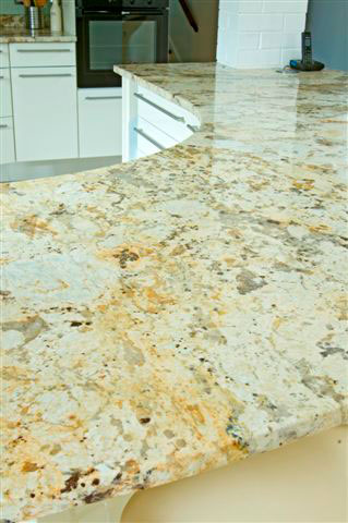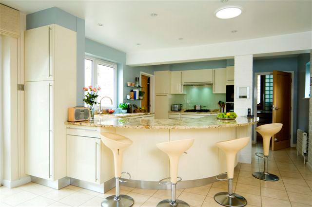 The sweep of granite curve connects this kitchen with an active family living space.